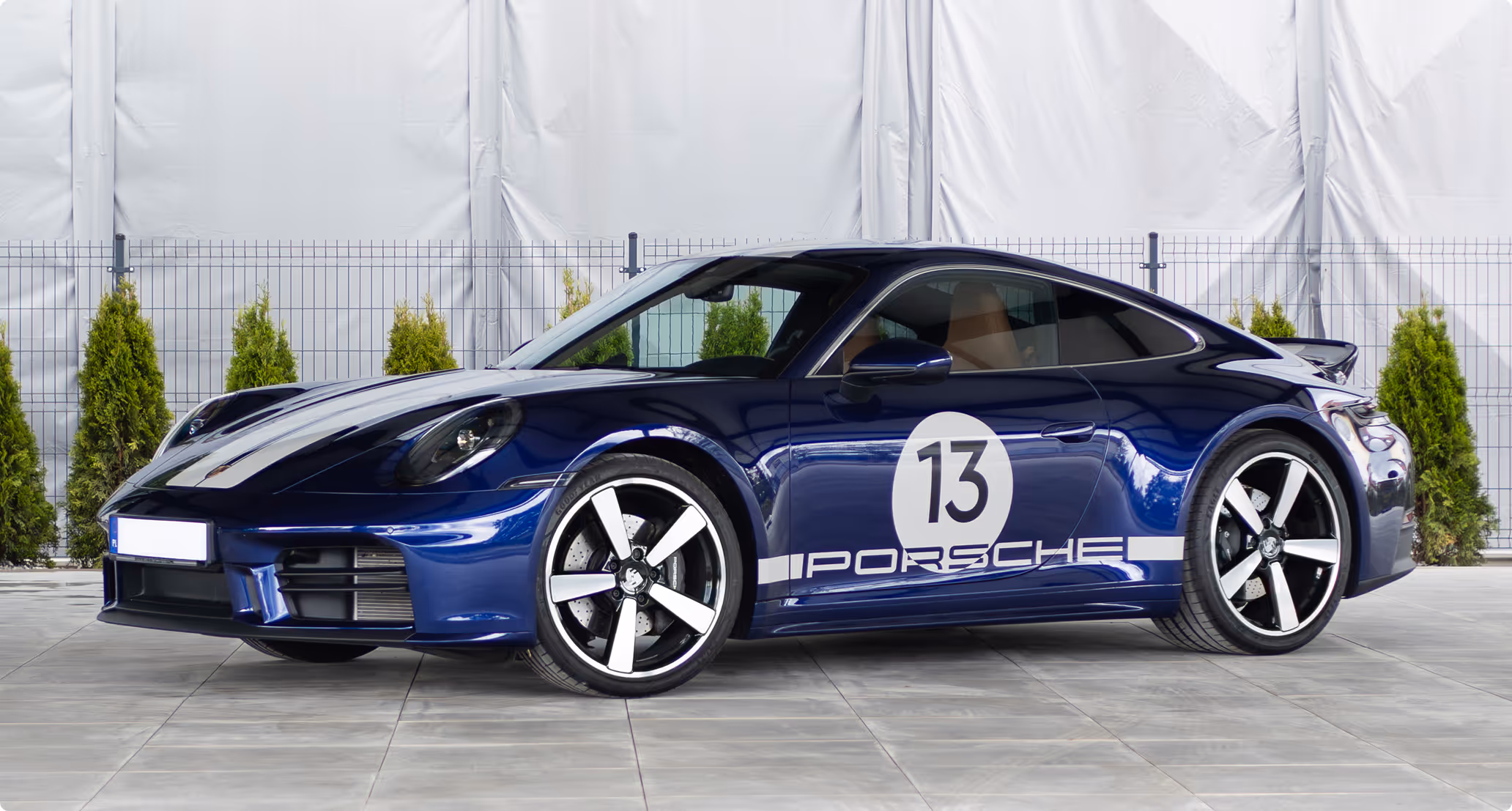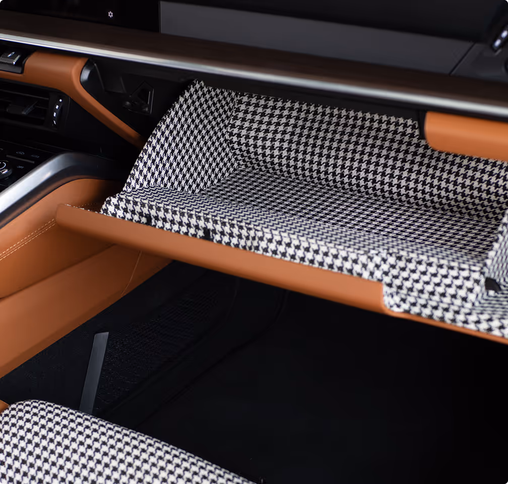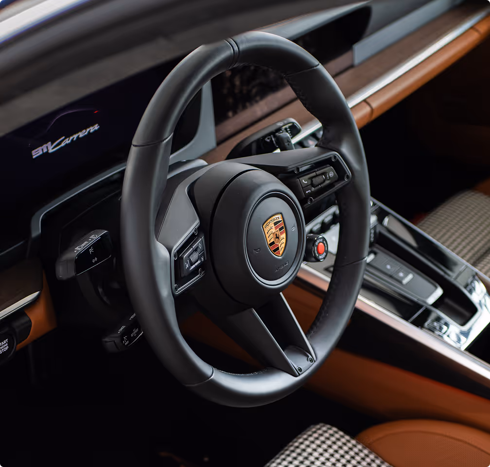 Porsche 911 inspirowane edycją Sport Classic, w którym klasyka spotyka się z nowoczesnością. Wnętrze wykończone skórą klubową w odcieniu Cognac z kultowym wzorem Pepita Black & White tworzy eleganckie połączenie retro i współczesnego stylu.